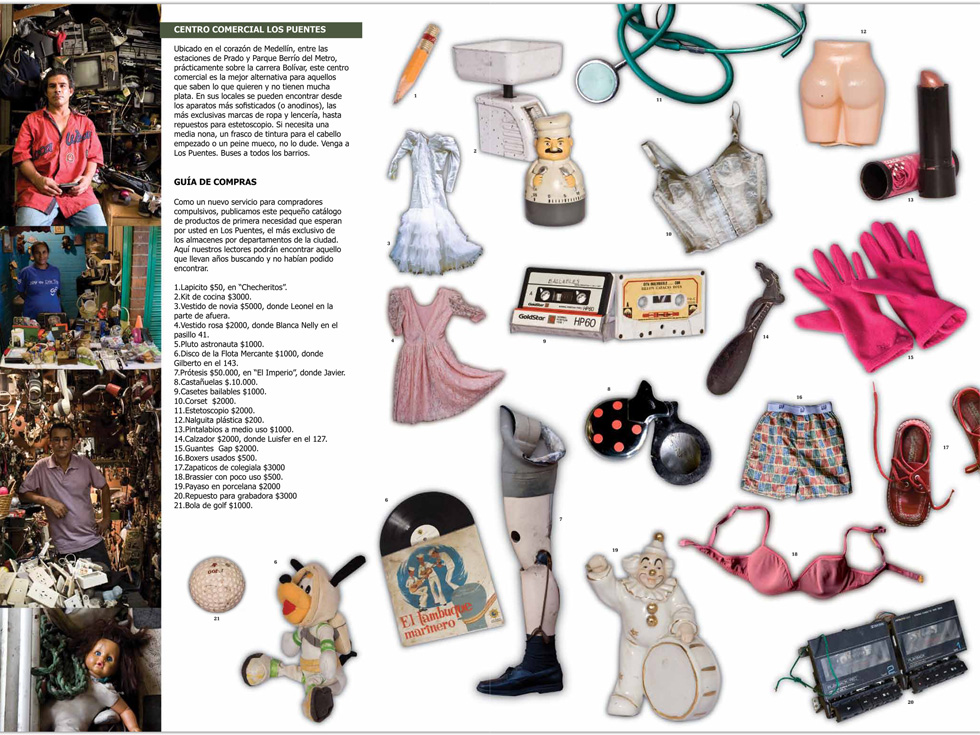 Ubicado en el corazón de Medellín, entre las estaciones de Prado y Parque Berrío del Metro, prácticamente sobre la carrera Bolívar, este centro comercial es la mejor alternativa para aquellos que saben lo que quieren y no tienen mucha plata. En sus locales se pueden encontrar desde los aparatos más sofisticados (o anodinos), las más exclusivas marcas de ropa y lencería, hasta repuestos para estetoscopio. Si necesita una media nona, un frasco de tintura para el cabello empezado o un peine mueco, no lo dude. Venga a Los Puentes. Buses a todos los barrios.