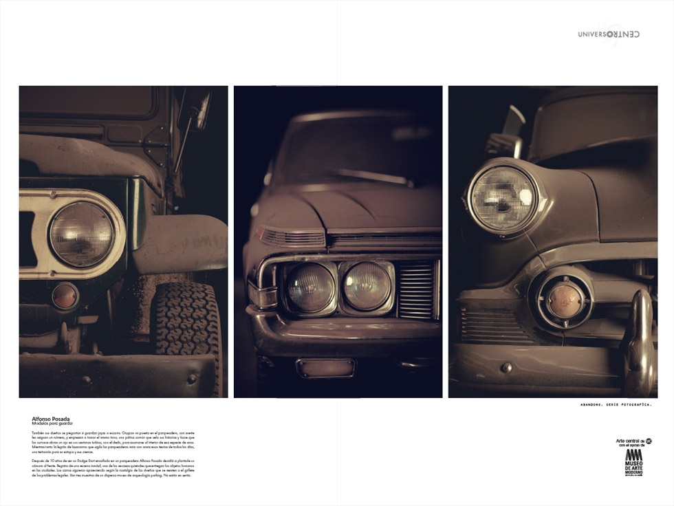 Después de 10 años de ver un Dodge Dart encallado en un parqueadero Alfonso Posada decidió a plantarle su cámara al frente. Registro de una escena inmóvil, una de las escasas quietudes que entregan los objetos humanos en las ciudades. Los carros siguieron apareciendo según la nostalgia de los dueños que se resisten o el grillete de los problemas legales. Van tres muestras de un disperso museo de arqueología parking. No están en venta.
