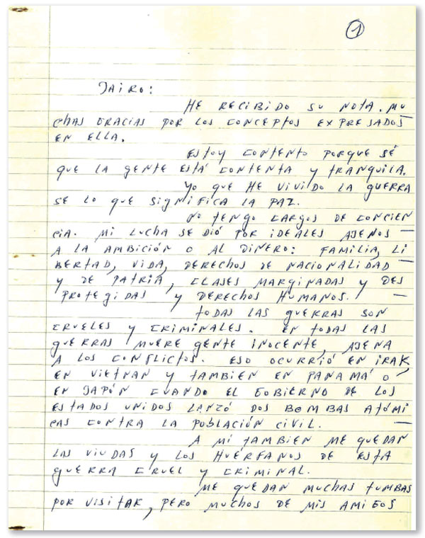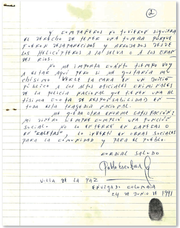 Y en el furgón me llegó la respuesta que nunca creí que llegara, con su firma y huella digital para que no quedarán dudas, carta testimonio de una historia negra cuyo final quedó trunco. Qué sería de este país si Pablo Escobar hubiera hablado ante los tribunales de sus cómplices entre militares, policías, políticos y empresarios. La carta nunca fue publicada hasta hoy, por que no era la carta del público, sino mi carta para intentar entender tanta destrucción y desquicio. Ya es hora de ir liberando los fantasmas.