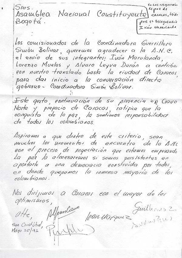 Le había propuesto a Alfonso Cano que escribiera un mensaje a la Asamblea Constituyente recién alzamos vuelo en Flandes, rumbo a Venezuela. "Lo haré", respondió. Cumplió su palabra: seguros en territorio venezolano, se acercó y puso en mi mano una hoja manuscrita con su firma y la de sus compañeros: "Lo prometido es deuda, doctor Marulanda". Guardé la nota, y de vuelta en la sala de la Constituyente se la entregué a Lorenzo Muelas para que la leyera delante del pleno. Tan pronto terminó, presenté la proposición que prometí a Cano cuando nos despedimos en Caracas: "lo prometido es deuda" también valía para mí. Era el paso más audaz imaginable en el camino de esos diálogos de paz... Lo revelaré en la última entrega de estas crónicas.