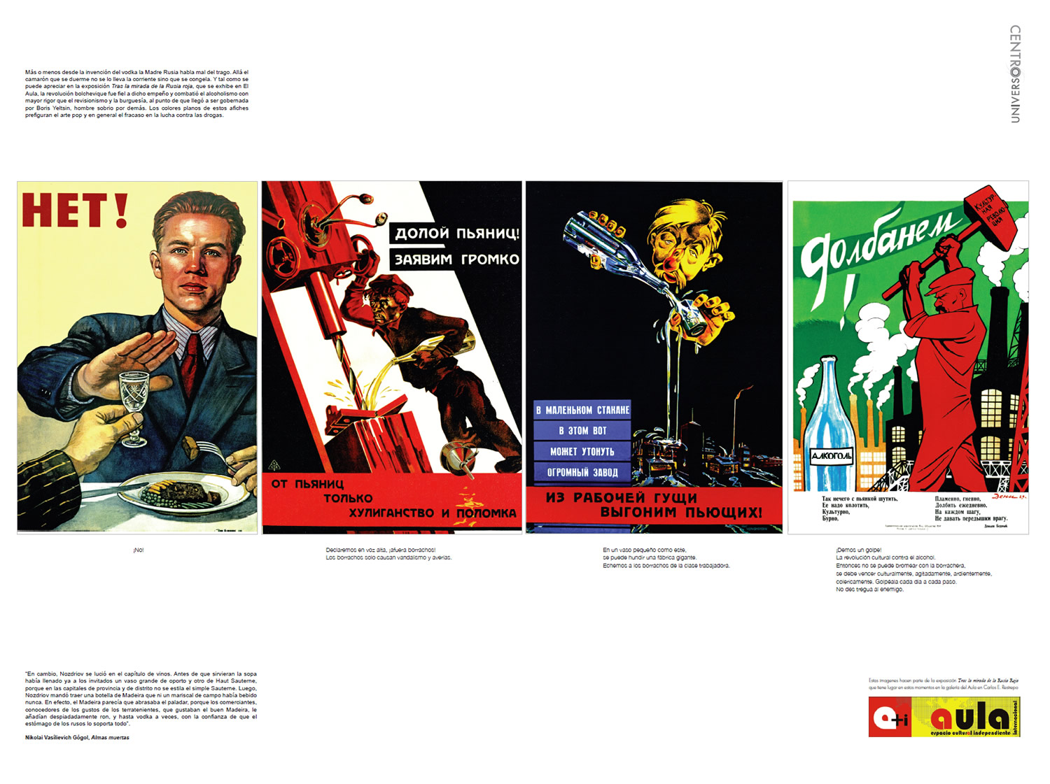 Más o menos desde la invención del vodka la Madre Rusia habla mal del trago. Allá el camarón que se duerme no se lo lleva la corriente sino que se congela. Y tal como se puede apreciar en la exposición Tras la mirada de la Rusia roja, que se exhibe en El Aula, la revolución bolchevique fue fiel a dicho empeño y combatió el alcoholismo con mayor rigor que el revisionismo y la burguesía, al punto de que llegó a ser gobernada por Boris Yeltsin, hombre sobrio por demás. Los colores planos de estos afiches prefiguran el arte pop y en general el fracaso en la lucha contra las drogas.