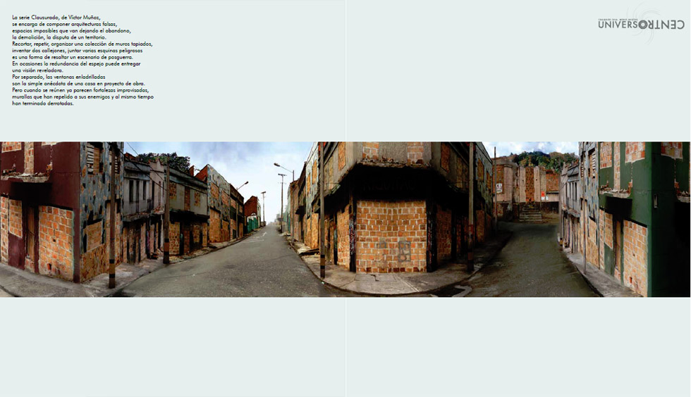 La serie Clausurado, de Víctor Muñoz, se encarga de componer arquitecturas falsas, espacios imposibles que van dejando el abandono, la demolición, la disputa de un territorio. Recortar, repetir, organizar una colección de muros tapiados, inventar dos callejones, juntar varias esquinas peligrosas es una forma de resaltar un escenario de posguerra. En ocasiones la redundancia del espejo puede entregar una visión reveladora. Por separado, las ventanas enladrilladas son la simple anécdota de una casa en proyecto de obra. Pero cuando se reúnen ya parecen fortalezas improvisadas, murallas que han repelido a sus enemigos y al mismo tiempo han terminado derrotadas.